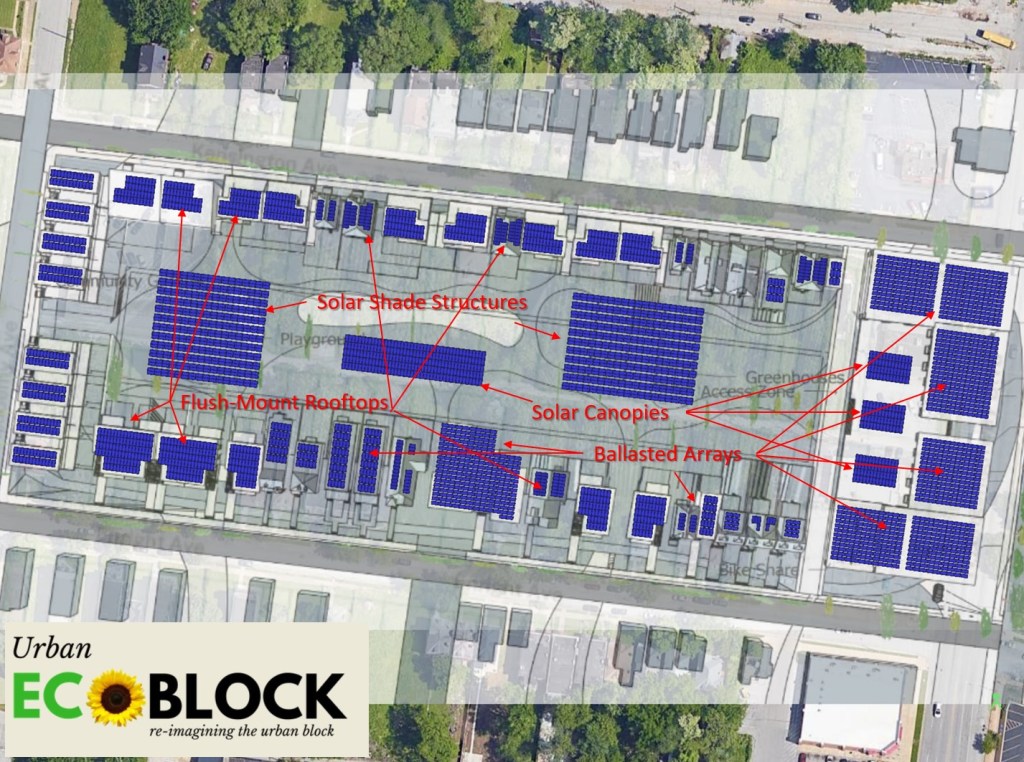 In working with the St. Louis City’s Planning and Urban Design agency, we created a theoretical model of an Urban EcoBlock to help them conceptualize this. We recently updated the model to estimate energy loads for each new and existing building based on gross square footage and EUI, and determined the capacity of each rooftop for solar, along with the common areas. Here’s what it looks like to be net zero energy: